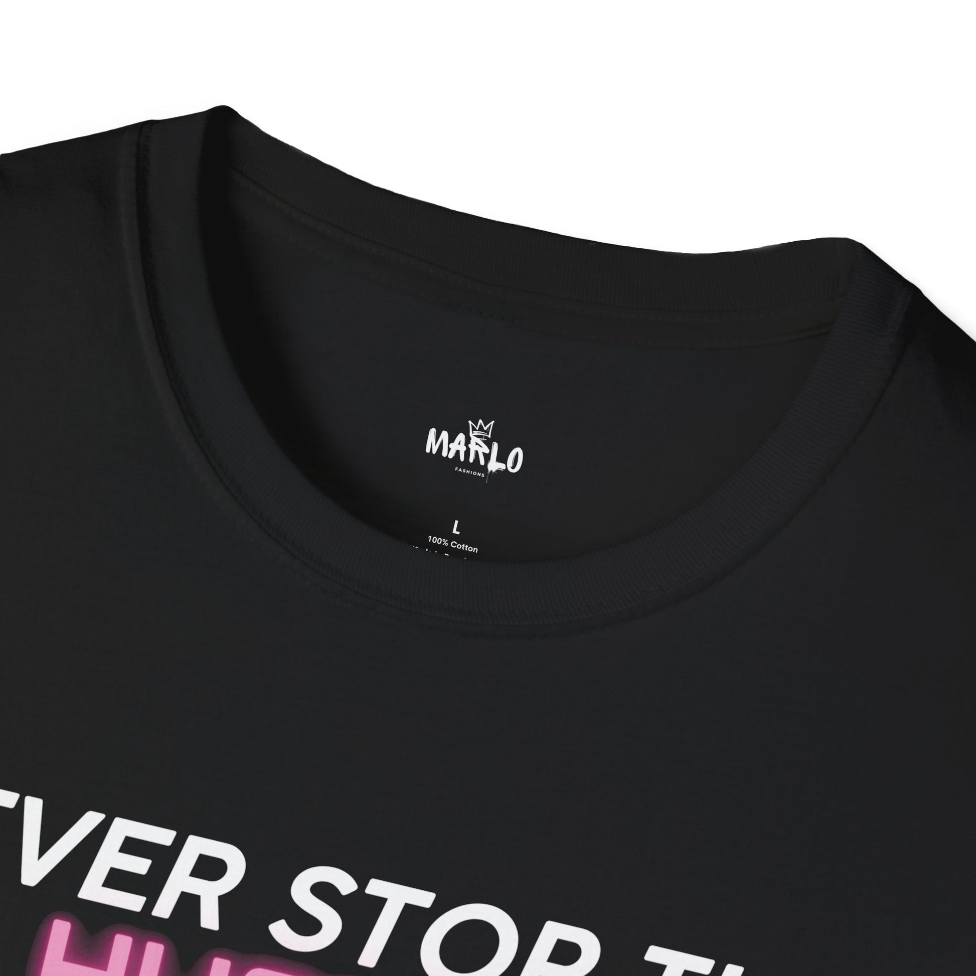 Grind culture? Nah, nap culture. This black tee flips the hustle mantra on its head with a bold, vertical acronym that celebrates the art of doing absolutely nothing. Featuring pink block lettering and a tongue-in-cheek breakdown of “HUSTLE” (spoiler: it’s all naps), this shirt is for the dreamers, the loungers, and anyone who’s ever hit snooze with pride.