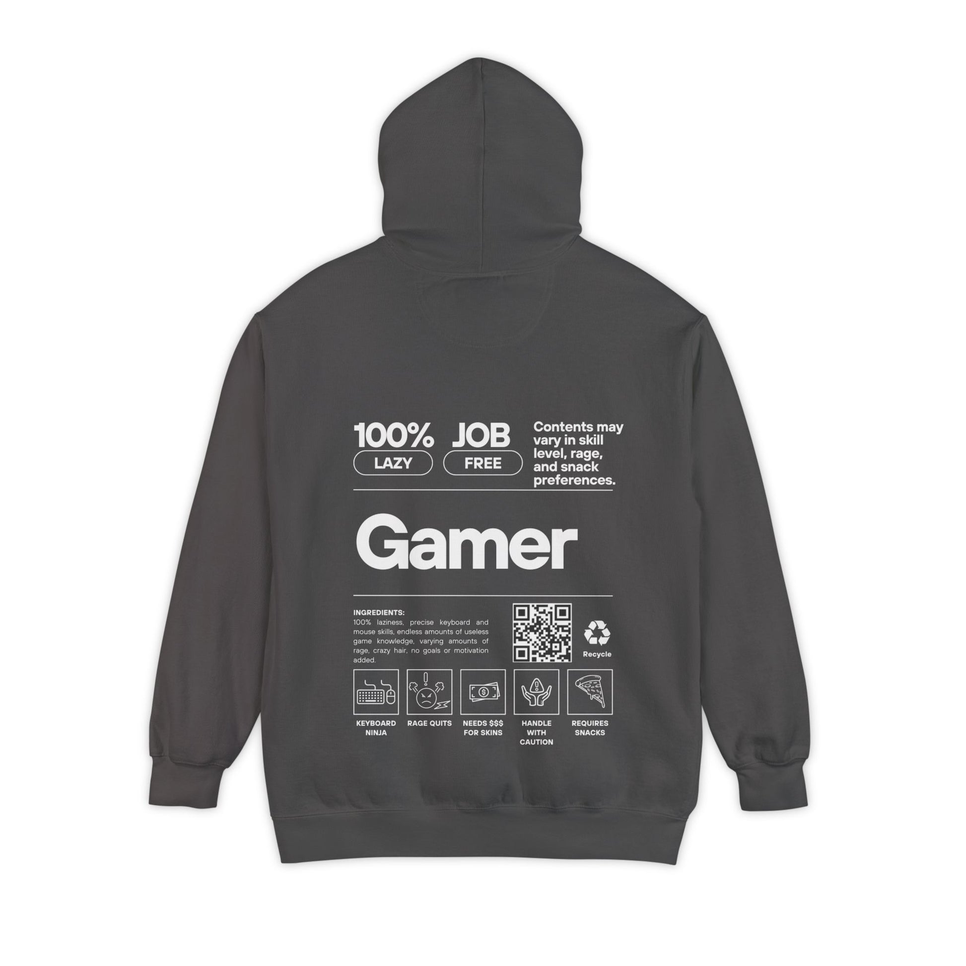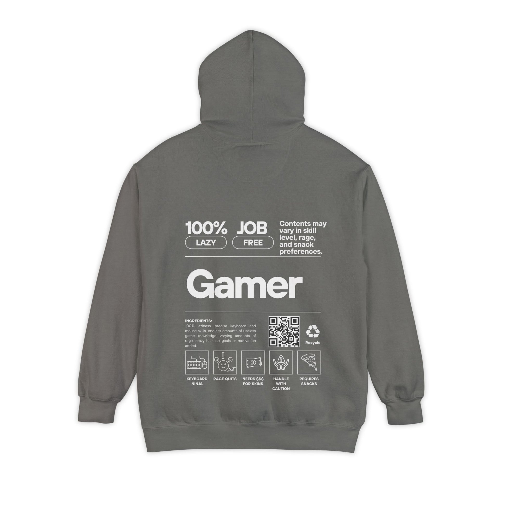Level up your wardrobe with the ultimate badge of gamer pride. This hoodie is more than just cozy—it's a hilarious tribute to the gaming lifestyle. Featuring bold “Gamer” branding and a satirical ingredient label on the back, it reads like a nutrition facts panel for elite players: