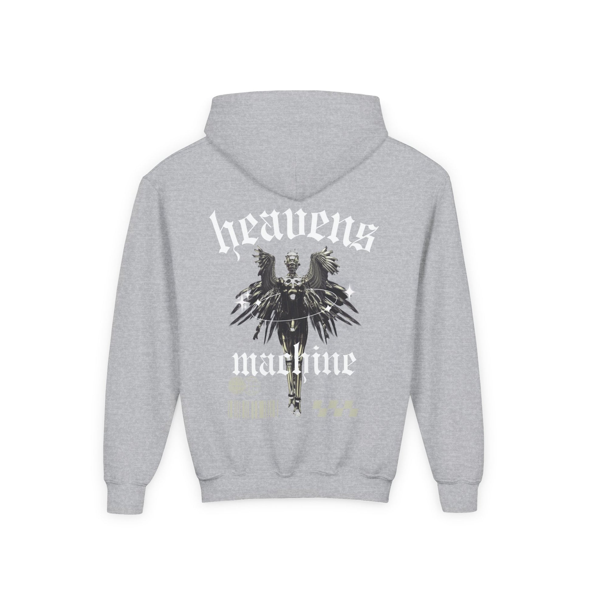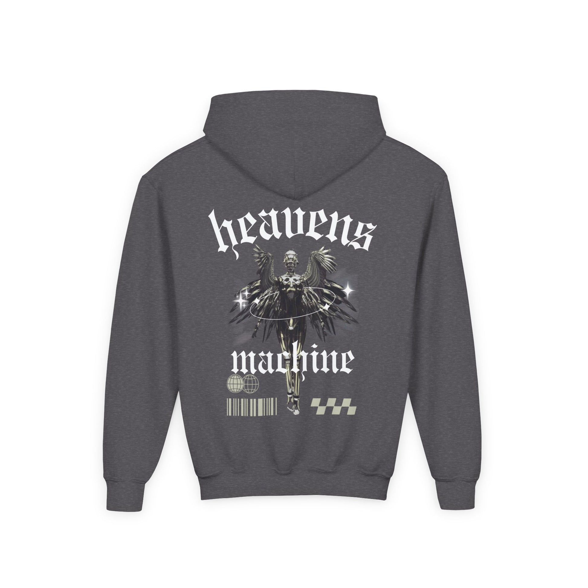 Unleash divine rebellion with the Heavens Machine™ Angelic Override Hoodie—where celestial grace meets industrial grit. This design fuses a radiant angelic figure with cybernetic elements, wrapped in a halo of light and framed by cryptic symbols like barcodes, globes, and checkerboard grids. The bold “heavens machine” typography anchors the piece with futuristic mystique, making it more than just apparel—it’s a visual manifesto.