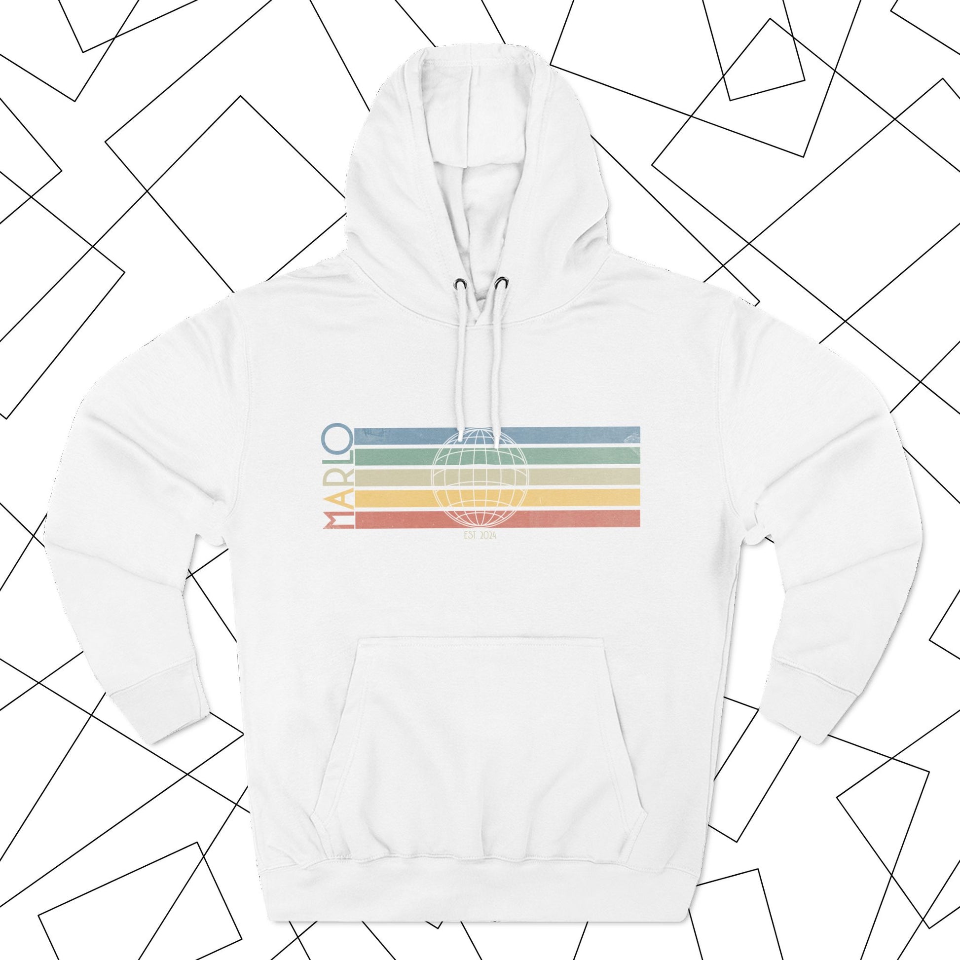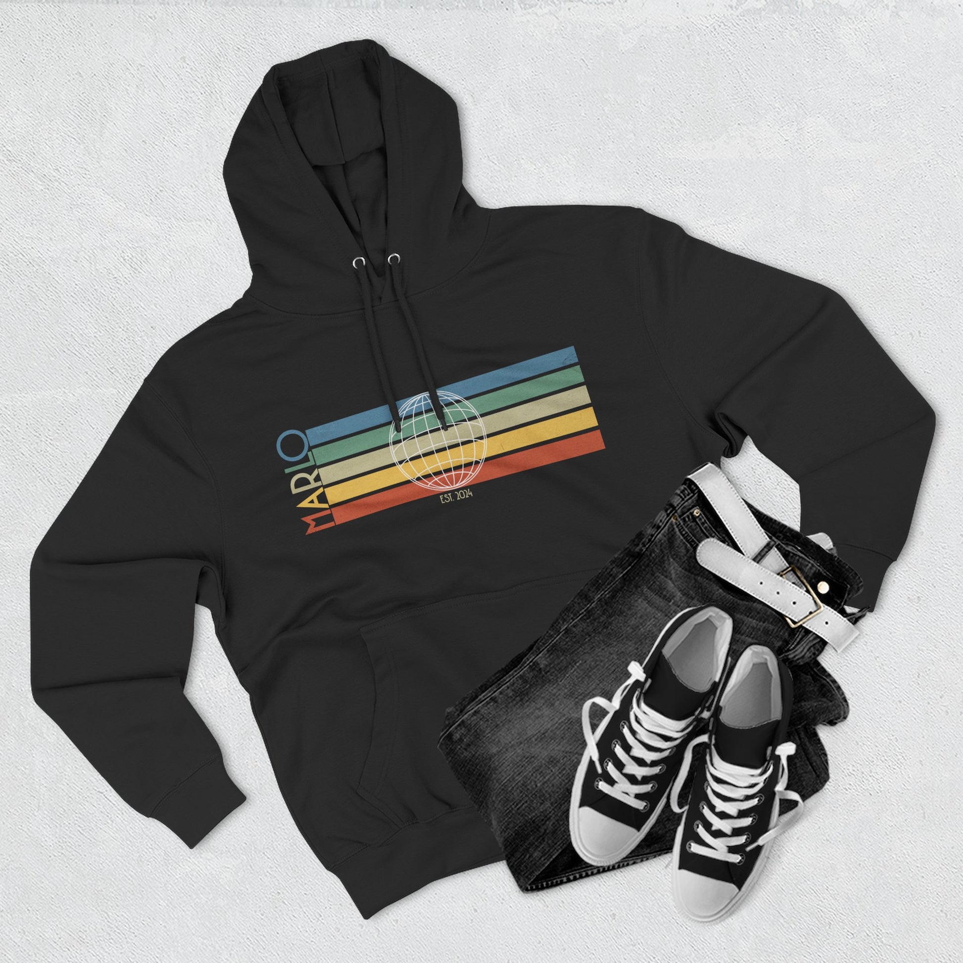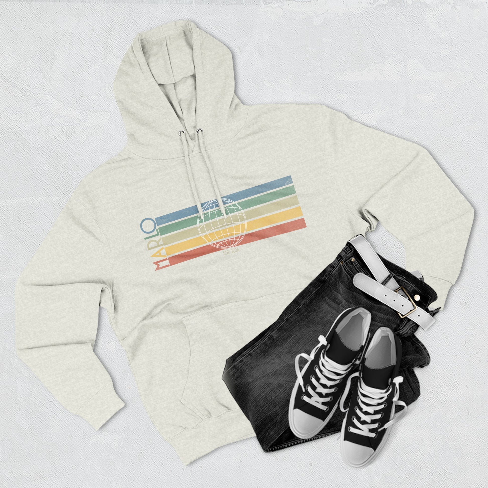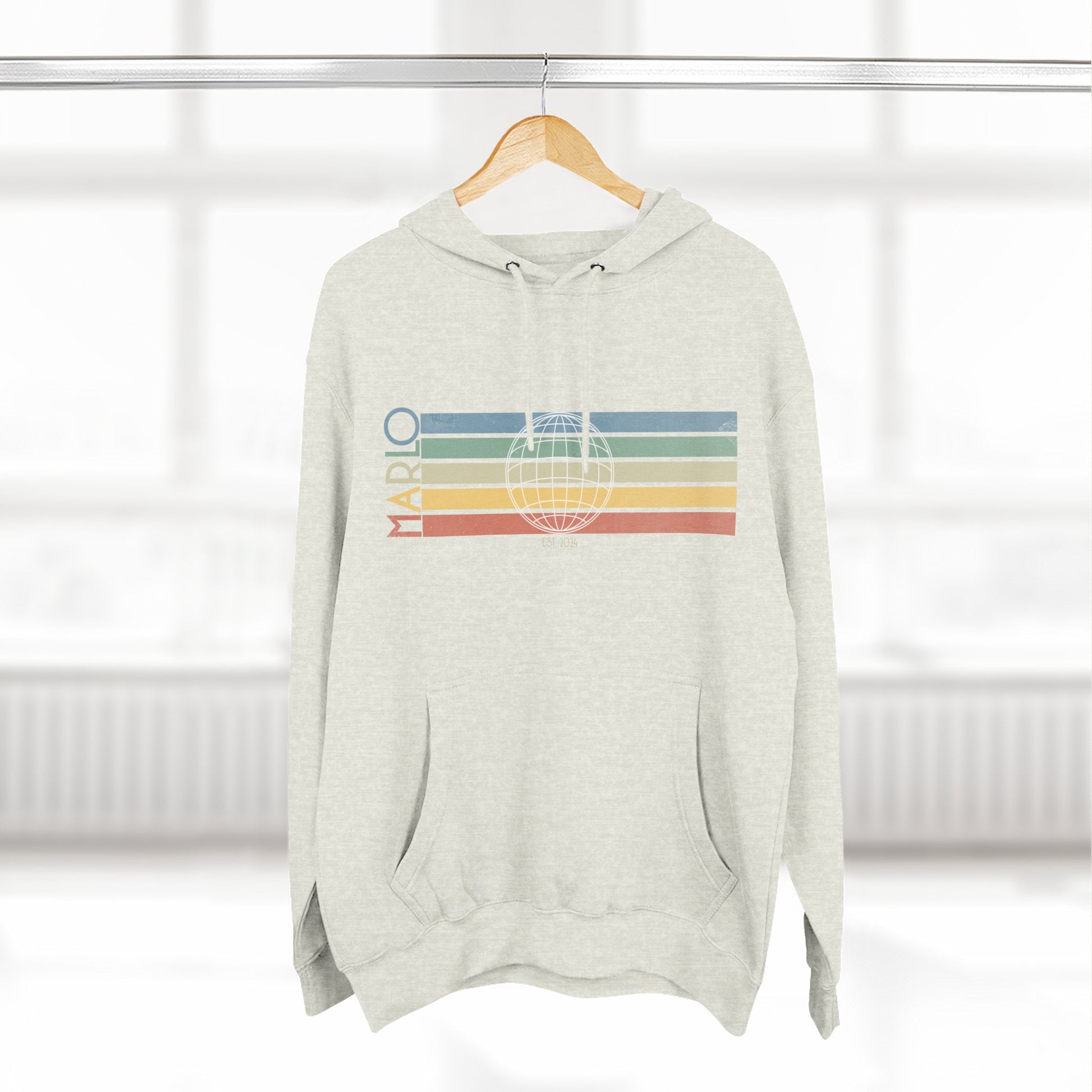 Retro vibes. Global vision. The MARLO Vintage Stripe Hoodie – Global Grid Edition blends throwback colorwork with futuristic geometry. Across the chest, faded multicolor stripes frame a crisp white spherical grid—evoking retro tech and planetary motion. The vertical MARLO branding on the left edge adds signature edge and balance.