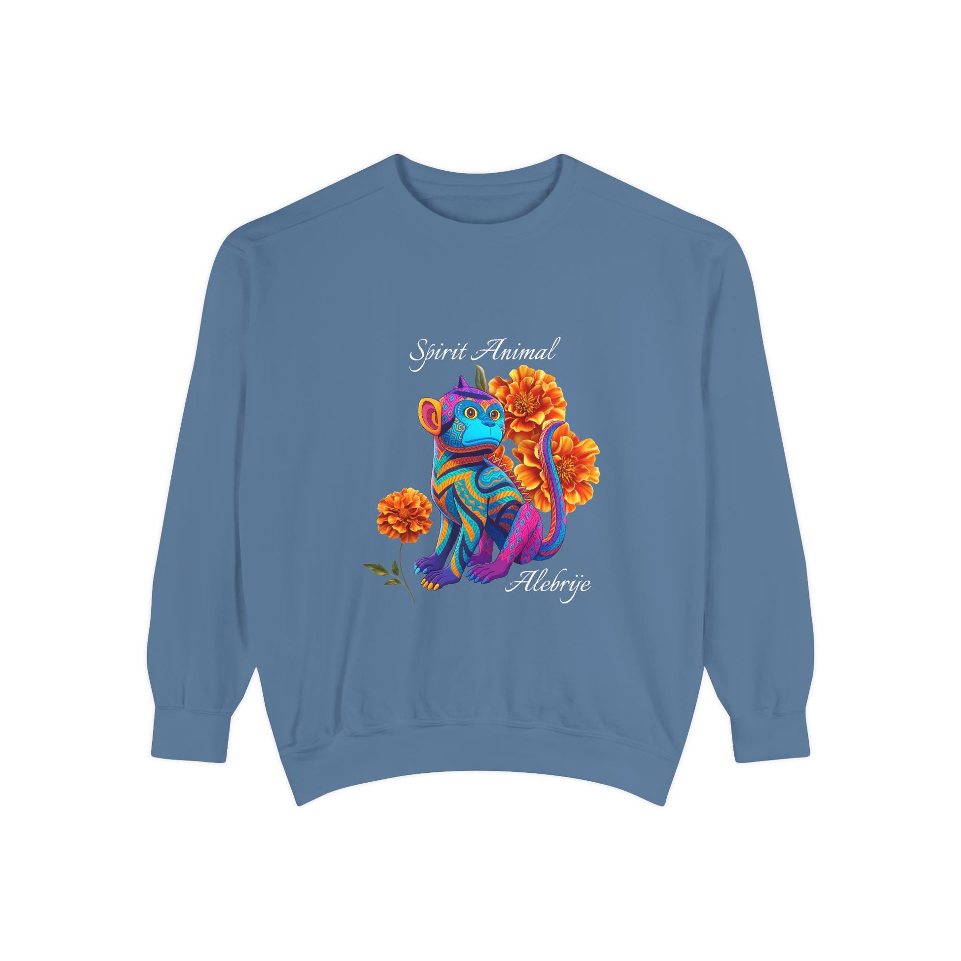 Channel vibrant energy and folkloric magic with our Spirit Animal Alebrije Sweatshirt, printed on the ultra-soft Comfort Colors 1566. This standout piece features a dazzling graphic of a mystical monkey-inspired Alebrije—a traditional Mexican spirit animal—surrounded by radiant orange marigold flowers, symbols of remembrance and celebration.